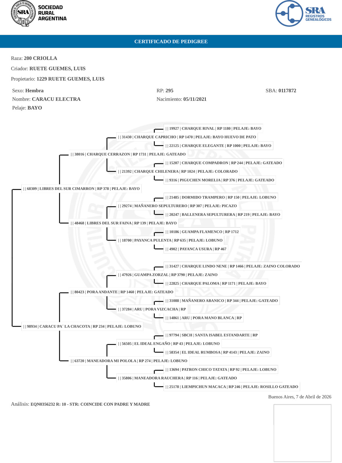 Criador: RUETE GUEMES, LUIS Propietario: 1229 RUETE GUEMES, LUIS Sexo: Hembra RP: 295 SBA: 0117872 Nacimiento: 05/11/2021 Pelaje: BAYO